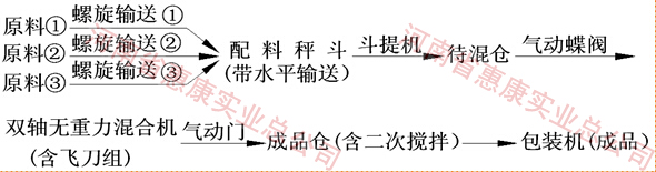 生產(chǎn)前只需將配方輸入智能化控制系統(tǒng)后,按一下啟動(dòng)按鈕,程序自動(dòng)完成原料的配比、物料的提升、攪拌,攪拌均勻后物料落入成品倉,進(jìn)行自動(dòng)定量灌裝。在第一批物料攪拌的同時(shí),第二批次原料即被送入待混倉,以節(jié)省配料時(shí)間,最大程度的提高產(chǎn)能。