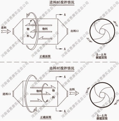 攪拌時,物料隨筒體沿逆時針方向旋轉的同時,在慣性作用下向左推移,從而達到混合目的。